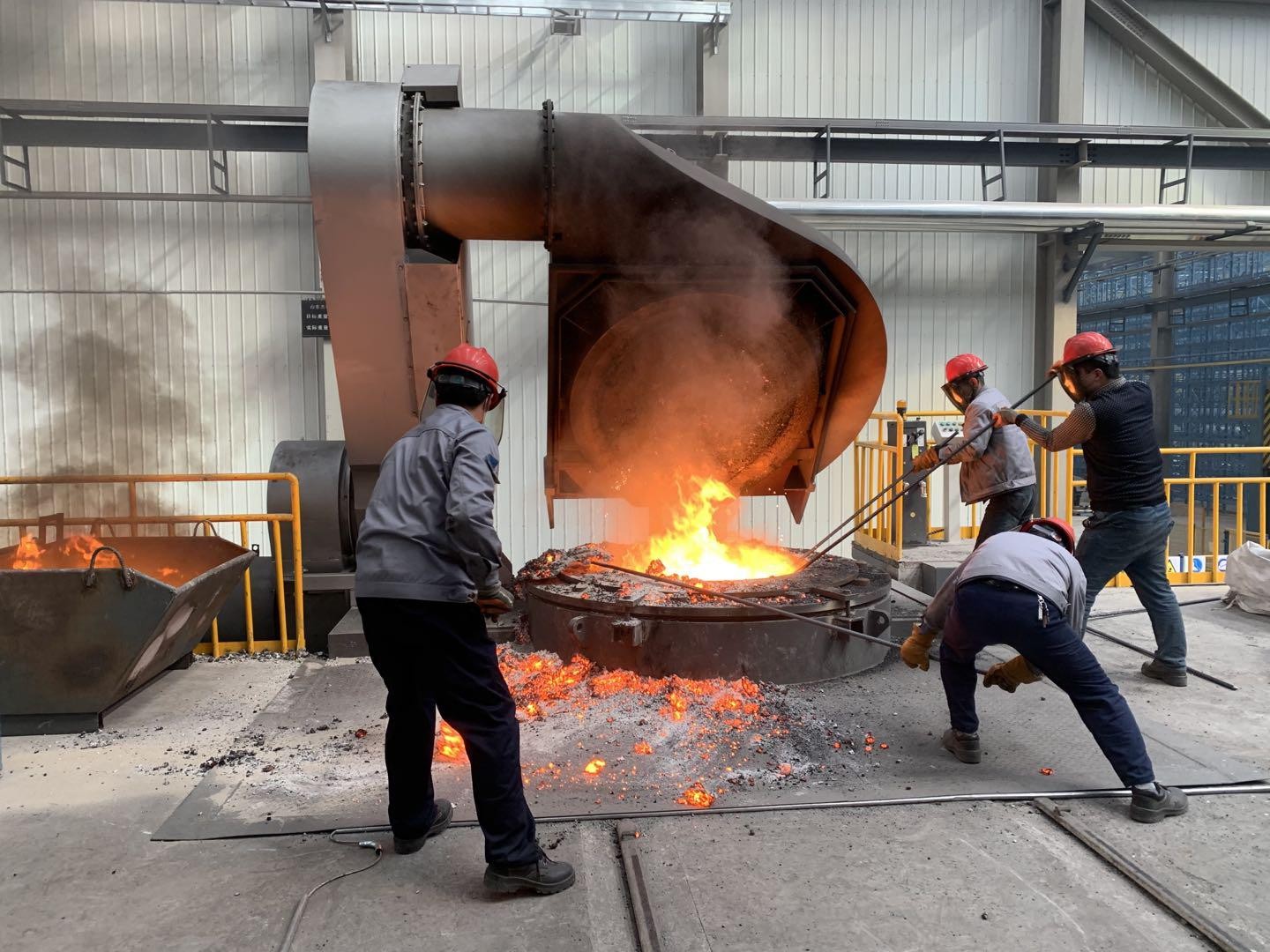 中頻電爐熔煉過程中,會產生大量的浮渣,漂浮凝結于鐵水表面,如果不將此渣去除將影響鑄件質量。目前國內鑄造行業撈渣作業采用的方式比較傳統——撈渣工穿上防護護具近距離站在爐口,用長鐵叉往爐外挑渣【見圖 1】火星鐵水四濺很不安全。爐內鐵水溫度能達到 1600 多攝氏度,爐口周邊也達到幾百攝氏度,尤其在夏天,爐口溫度更高,工作環境十分惡劣;脫硫渣具有很強的粘連性,爐渣聚在一起十分沉重,人工往外拔渣勞動強度很大,而且要拔很多次才能把脫硫渣拔干凈,工作效率十分低下;拔渣時會粘連很多鐵水,造成原材料的大量浪費。